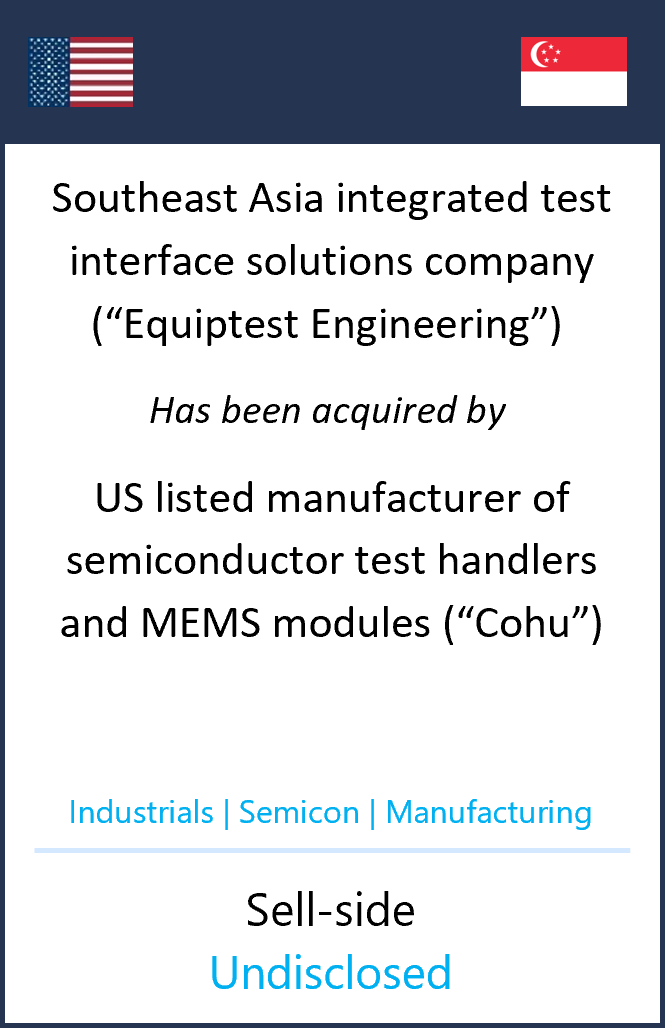 Our team served as an exclusive advisor to the shareholders of Equiptest Engineering (“Company”), on its acquisition by Cohu Inc., a United States headquartered, global supplier of equipment and services to the semiconductor manufacturing industry.