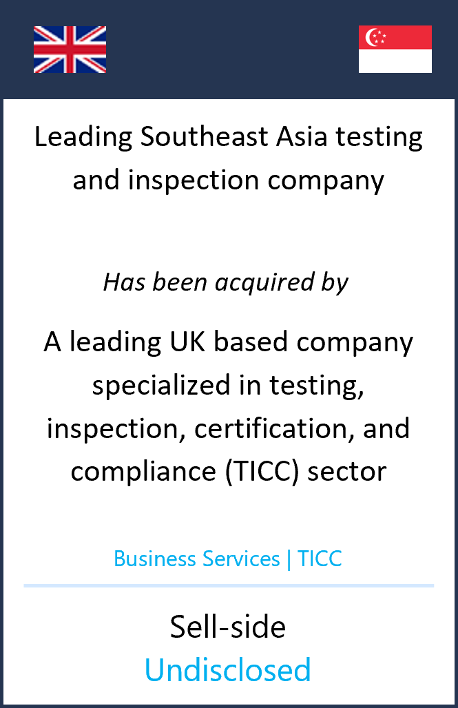 Our team advised the shareholders of a leading global UTM, NDT, and third-party inspection company head quartered in Singapore, on its acquisition by a UK based buyer that is a dynamic organization of specialist businesses focused on the testing, inspection, certification, and compliance (TICC) sector which is backed by a leading European private equity.